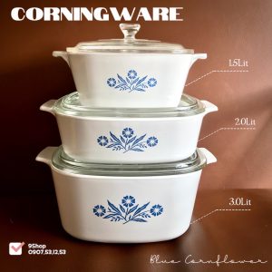 ![[Hiếm] Vintage Corning Ware - Blue Cornflower Casserole - [Bán lẻ] 01 Quánh/ Nồi Tay Cầm Thuỷ Tinh Chống Sốc Nhiệt Thượng Hạng 100% New Sản Xuất Tại: Mỹ Công Nghệ và Điều Phối: Mỹ Quy cách: Quý khách lựa chọn trong các phân loại Model P81B: Full dài 24cm - đường kính lòng 14.5cm x cao 6.5cm (500ml) - bán lẻ 1.050k Model P82B: Full dài 24.5cm - đường kính lòng 15.5cm x cao 7cm (750ml) - bán lẻ 1.150k Model P83B: Full dài 26.5cm - đường kính lòng 17.5cm x cao 5cm (750ml - bán lẻ 1.150k > Chống dính >Dùng được cho máy rửa chén >Dùng được cho vi sóng + Lò nướng >Tay cầm phụ >Không chứa PDOA >Thân thiện với môi trường >PFAS Free === - Nồi thủy tinh Corning Ware được làm từ chất liệu thủy tinh có độ bền cao, có thể chịu được sốc nhiệt khi thay đổi môi trường nóng, lạnh đột ngột. Bạn có thể sử dụng nồi để đun nấu ngay khi vừa lấy ra từ ngăn đá mà không ảnh hưởng đến chất lượng sản phẩm. - Sản phẩm có khả năng giữ nhiệt tốt, điều này rất lợi cho việc đun nấu vì bạn chỉ cần tốn một lượng nhiệt ít mà vẫn đảm bảo được độ chín tới của thực phẩm. Bạn nên để nồi nóng dần lên từ từ bằng cách giữ lửa nhỏ hay vừa tránh việc thức ăn bị cháy và giúp tiết kiệm nhiên liệu hiệu quả. - Xung quanh nồi có in hoa văn đẹp mắt. Hoa văn không bị phai màu sau nhiều năm sử dụng, đáp ứng được tiêu chuẩn của FBA của Hoa Kỳ về tính không độc của hoa văn trang trí. - Nồi thủy tinh Corningware được nhiều khách hàng ưa chuộng nhờ được làm từ chất liệu cao cấp, chịu nhiệt tốt, sử dụng được trong lò vi sóng và máy rửa chén. Sản phẩm không chứa chì hay tương tác hóa học với thức ăn trong quá trình sử dụng, đảm bảo an toàn sức khỏe cho gia đình bạn. An toàn sử dụng: Tất cả thủy tinh và vật liệu gốm thủy tinh đều có thể bể vỡ, nên vui lòng cẩn thận khi sử dụng. Không dùng nồi Corningware để chiên. Không dùng cho bắp rang bơ, thắng đường hay nấu kẹo. Không đặt nồi Corningware trống vào lò microwave. Đặt nồi Corningware nóng lên miếng lót vì sức nóng của nó có thể làm hư bề mặt tiếp xúc. Không sử dụng nắp đậy Pyrex trong lò nướng hay lò điện. Không đặt nắp đậy Pyrex đang nóng lên bề mặt lạnh và ẩm ướt, hay cầm bằng miếng vải ướt. ===](https://corellevietnam.com/wp-content/uploads/2026/04/6cdcb956-9dfe-449e-8c28-a8b9043e57f9-300x300.jpeg)